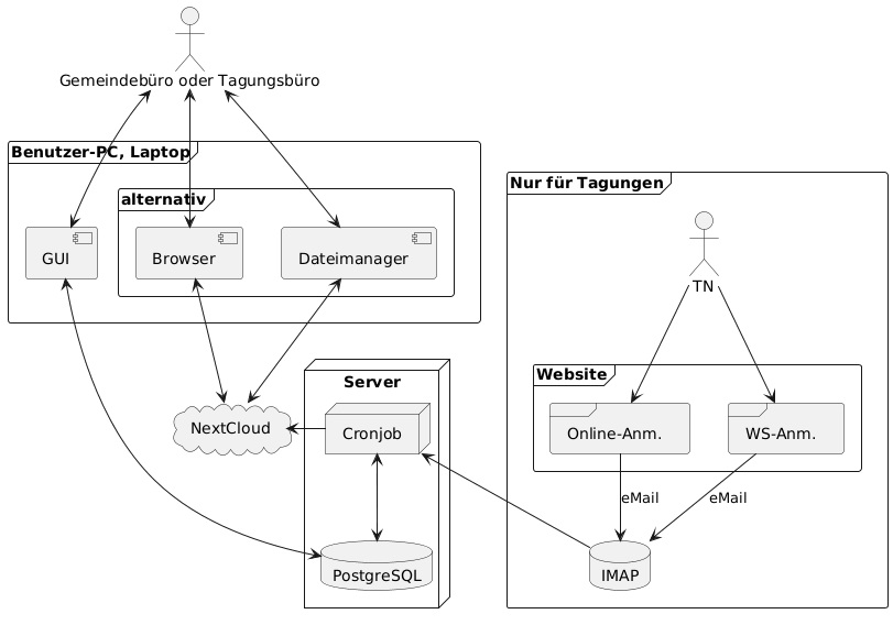 Benutzer und Benutzerinnen erfasse und ändern die Daten über die graphische Benutzeroberfläche, kurz GUI. Auf dem Server werden durch den „Cronjob“ (ein zeitgesteuertes Programm) regelmäßig Adresslisten und eine Reihe weiterer Auswertungen hergestellt und in der Cloud gespeichert. Benutzer und Benutzerinnen können alle dies Auswertungen z.B. über einen Browser jederzeit anschauen, downloaden oder ausdrucken.