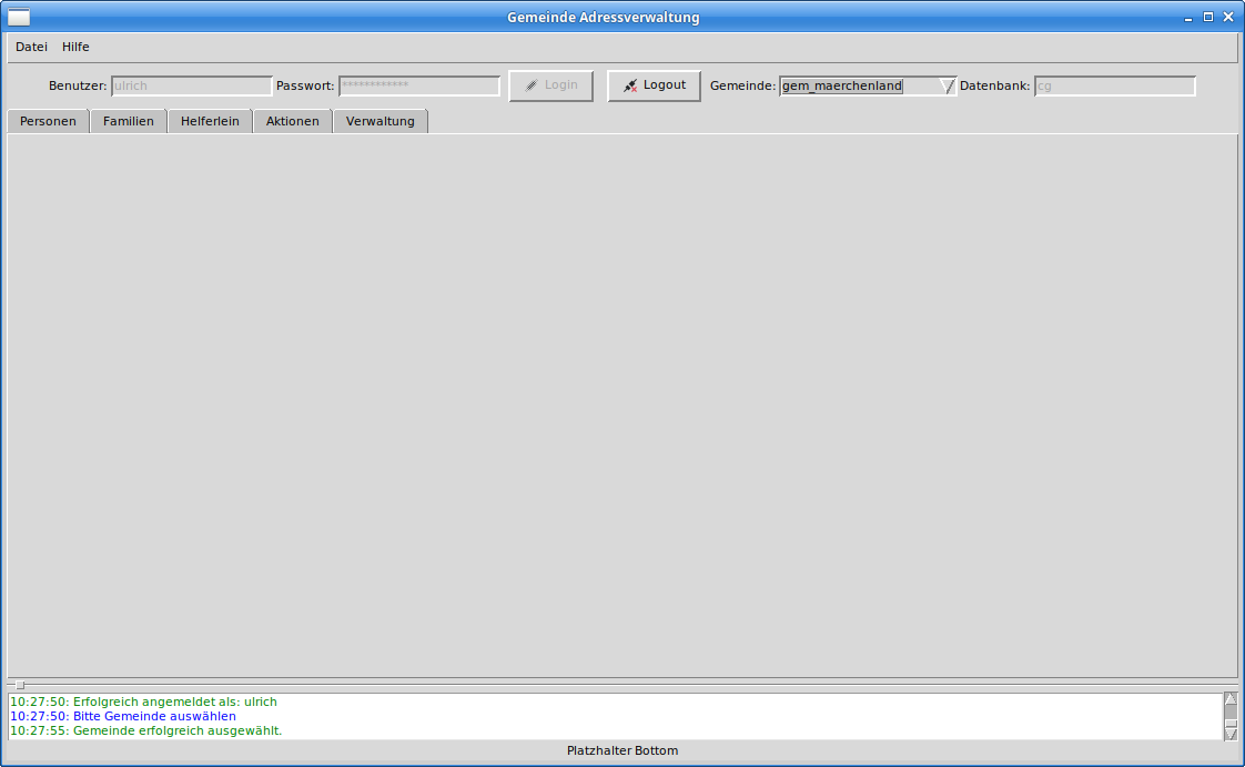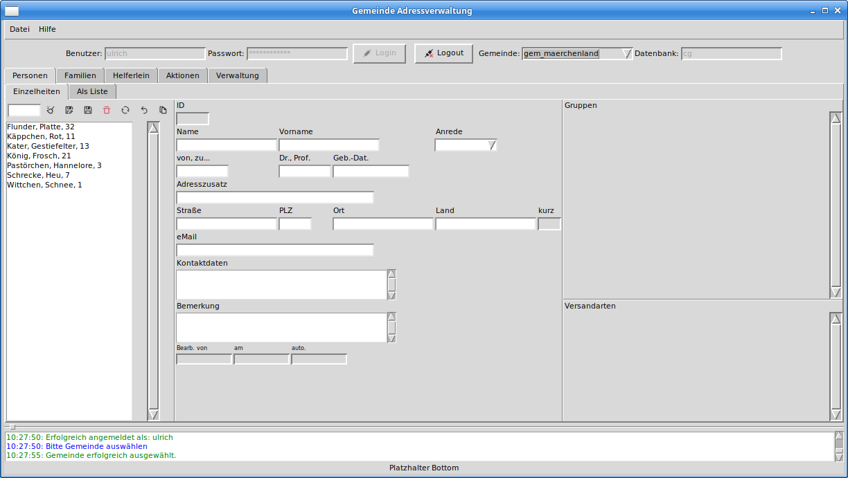 Ganz unten ist ein Fenster, in dem Nachrichten z.B. über das erfolgreiche Speichern von Datensätzen angezeigt werden. Die Nachrichten können auch mal lang sein, etwa bei der Vorbereitung oder Durchführung von eMail-Versänden. Bei Bedarf kann dieses Fenster an seinem oberen Rand verkleinert oder vergrößert werden.