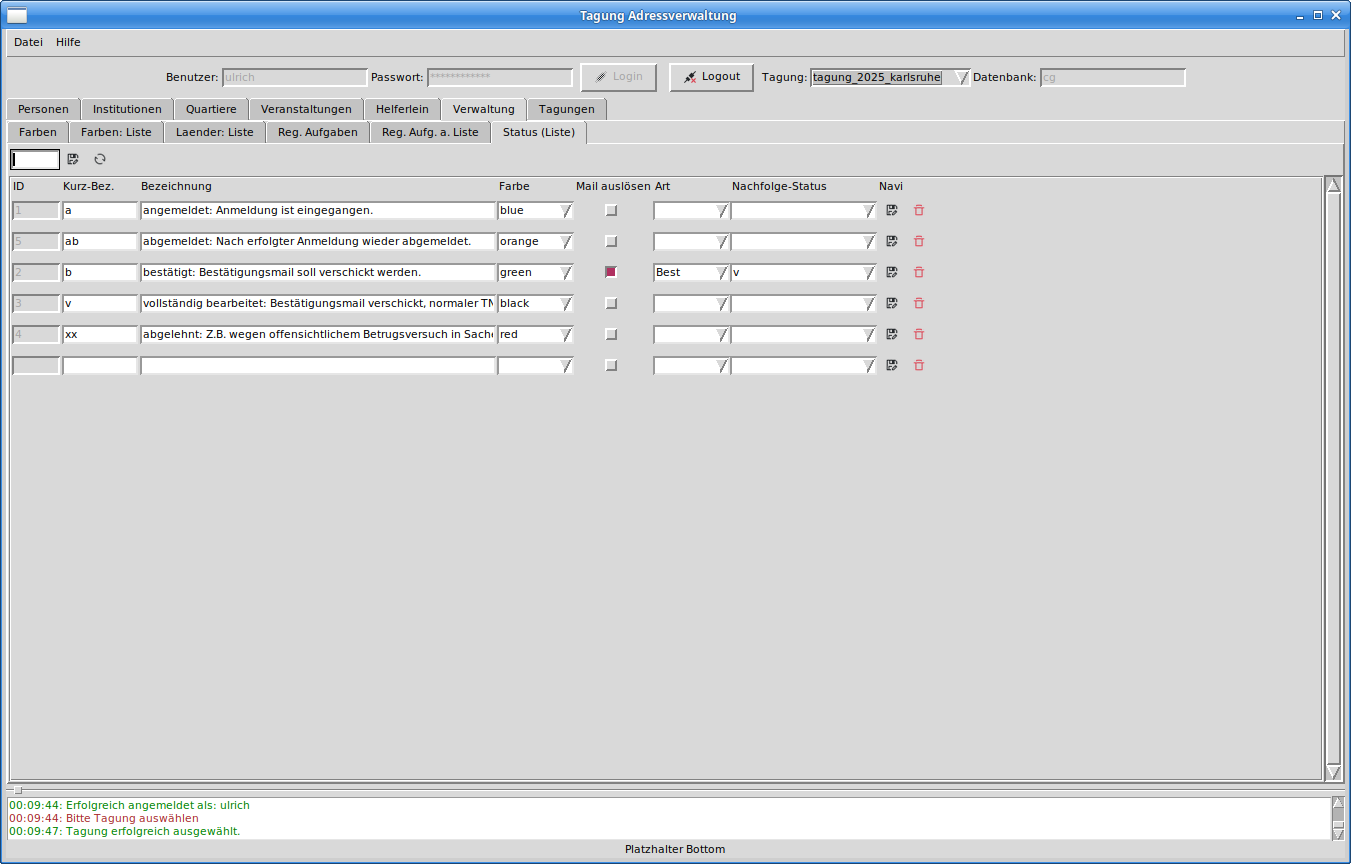 Verschiedene Daten lassen sich auch (oder nur) in einer Listenansicht bearbeiten. So z.B. der Anmeldestatus bei Tagungen, aber auch Farben, Länder usw. Vor allem für Tagungen gibt es eine Reihe von speziellen Listenansichten, die nur die für bestimmte Anlässe relevanten Datenfelder zeigen; so z.B. für die Finanzen oder die Festlegung der Workshops.
