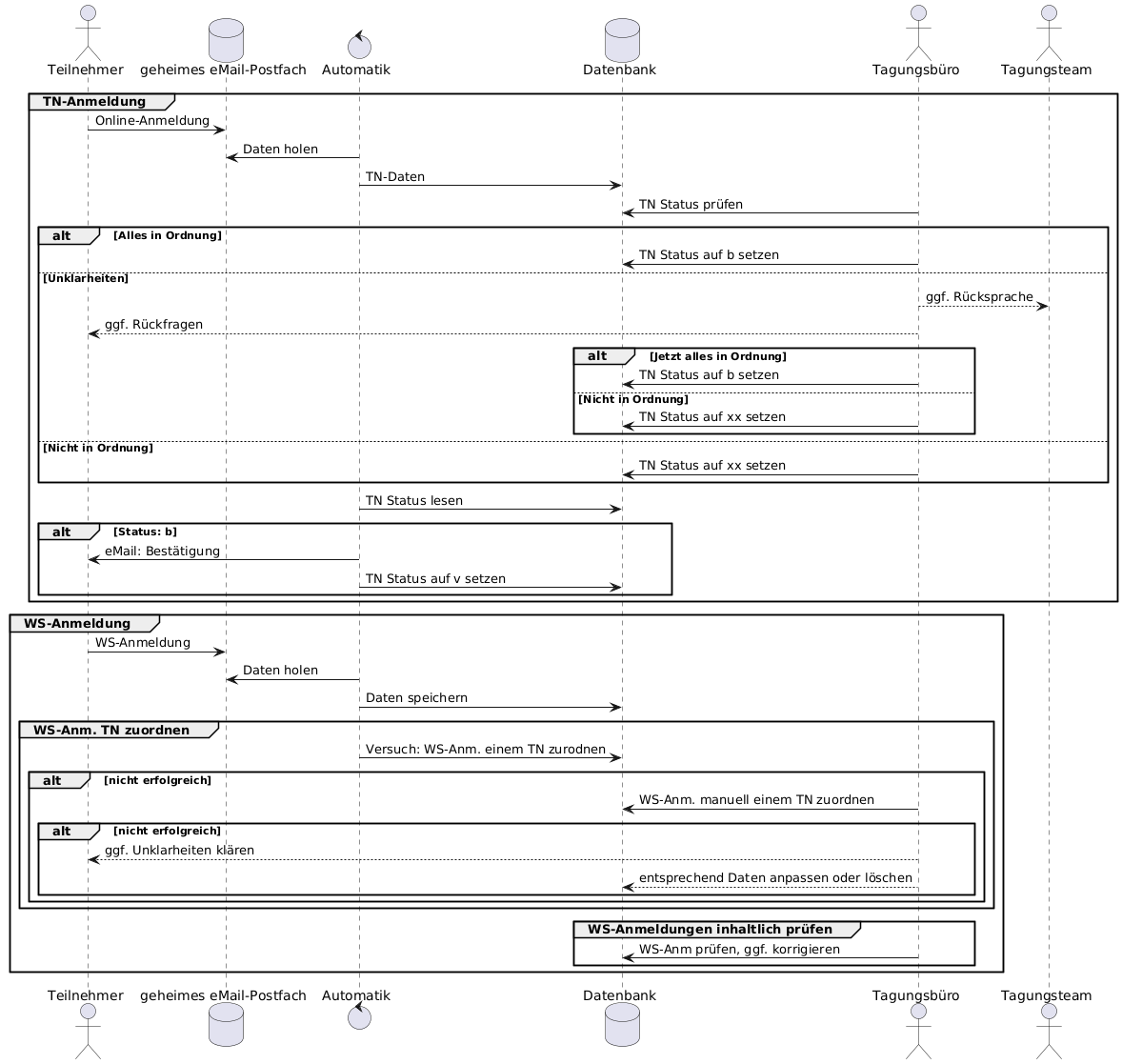 - Meldet sich jemand online zur Tagung an, werden dessen Daten automatisch in die DB eingetragen, der TN erhält den Status